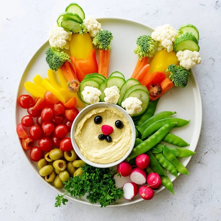 - Vegetables: 1 cup baby carrots, 1 cup sugar snap peas, 1 cup cherry tomatoes (mixed colors), 1 cup broccoli florets, 1 cup cauliflower florets, 1 cup cucumber slices, 1/2 cup radishes thinly sliced, 1 yellow bell pepper sliced, 1 red bell pepper sliced, 1/4 cup black olives (for eyes and nose), 1/4 cup green onions or chives (for grass accents)