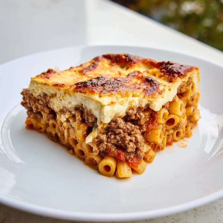 Save A classic Greek casserole featuring layers of tubular pasta, savory spiced beef, and creamy béchamel sauce, baked to golden perfection.