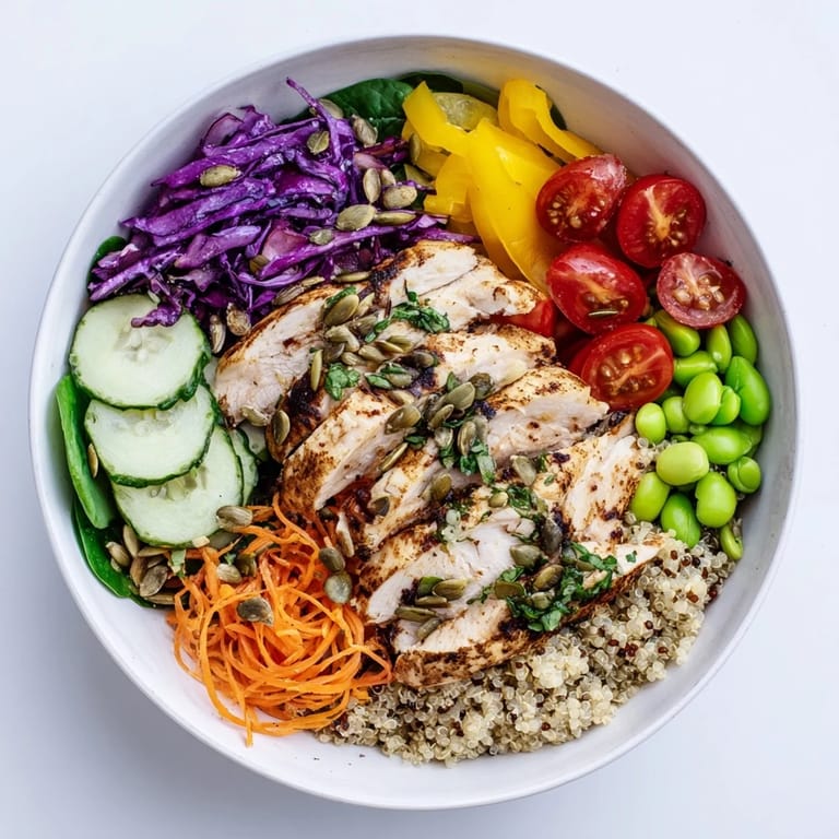 Save A vibrant, nutrient-packed meal featuring colourful vegetables, wholesome grains, lean protein, and a zesty dressing is designed for easy meal-prep and beautiful presentation. Perfect for busy schedules and health-conscious eaters, these colourful bowls brighten up any table.