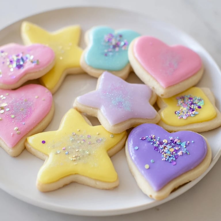 Save Whimsical, buttery sugar cookies shaped like hearts and stars, decorated with sparkling royal icing—perfect for a magical tea party or a royal celebration.