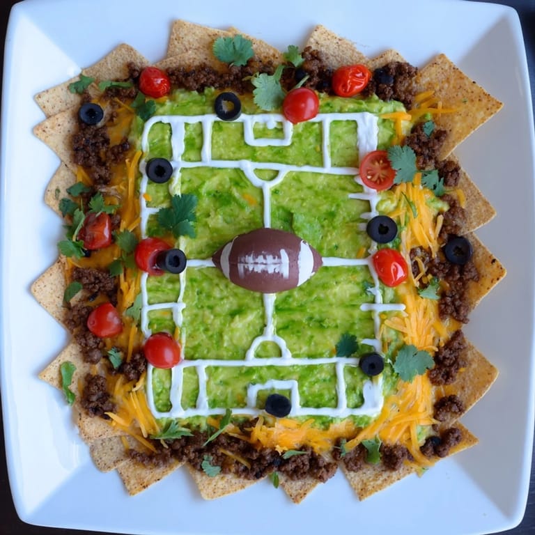- Toppings & Field Decorations: 120 g (1/2 cup) sour cream (for field lines), 2 ripe avocados mashed (for field base), 100 g (1/2 cup) prepared salsa, 100 g (1 cup) chopped cherry tomatoes (for fans or decoration), 1 small red bell pepper diced (for corner flags), 60 g (1/4 cup) sliced black olives, 2 tbsp chopped fresh cilantro