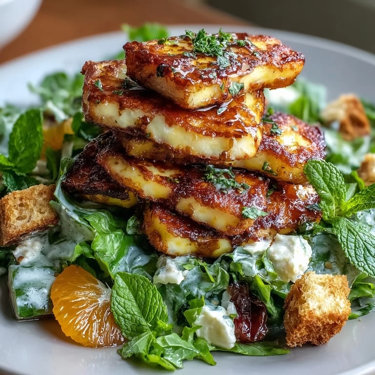 This salad is hearty enough to serve as a main course for lunch, but I've also plated it as a side for grilled lamb or roasted chicken. If you want to stretch it further, double the halloumi and add a handful of cooked quinoa or freekeh to the base. A few toasted pistachios or walnuts scattered on top add richness and a satisfying crunch that makes it feel even more substantial.