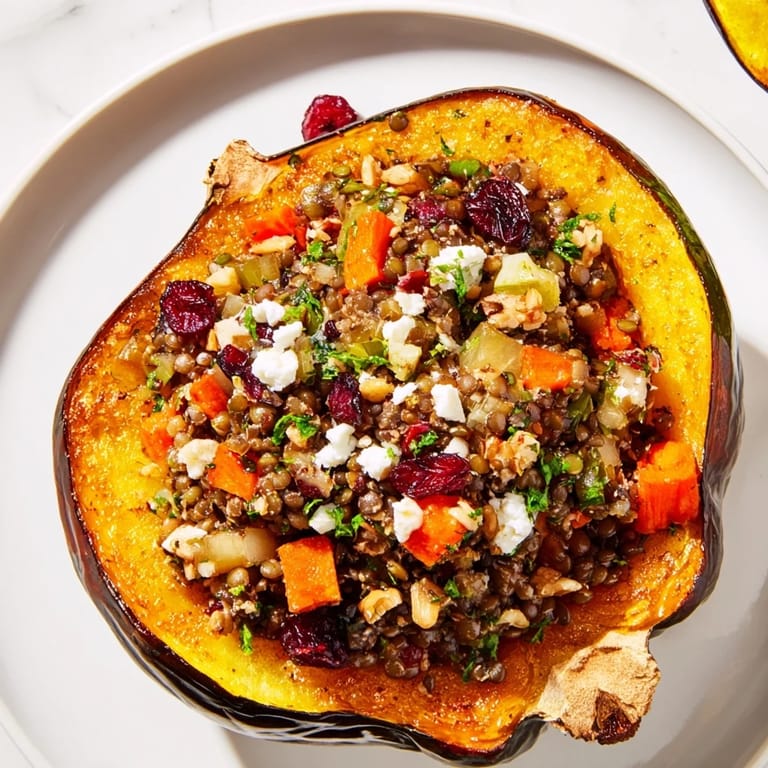 A hearty, flavorful dish featuring acorn squash halves filled with a savory mixture of lentils, walnuts, vegetables, and herbs. Perfect as a vegetarian main or festive side.