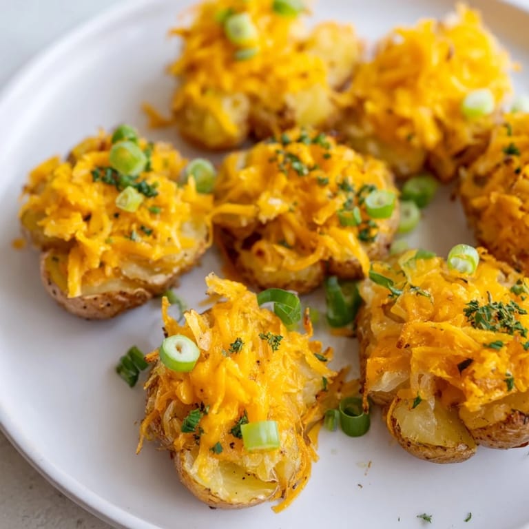Baby potatoes are boiled until tender, then smashed and roasted for maximum crunch. Olive oil, garlic powder, smoked paprika, salt, and pepper create savory depth. Shredded cheddar cheese and sliced green onions are melted over the top, finishing with fresh parsley. Delightful as a party snack or alongside other favorites, these golden bites offer warm, cheesy flavor and vibrant green accents. Serve hot, with your preferred dipping sauce for even more enjoyment. Gluten-free and vegetarian, these potato bombs are a breeze to prepare and a hit at any gathering.