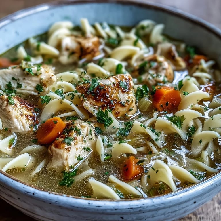 Save My neighbor stopped by on a grey afternoon with her daughter, both looking half-frozen from the walk over, and I knew exactly what the moment called for. There's something about chicken noodle soup that doesn't require much thinking, just the comfort of warmth rising from a pot and the kitchen filling with the smell of sautéed vegetables. This version came together almost by accident, born from what I had on hand and a quiet need to feed people without fuss. It's become my go-to when the weather turns, when someone's under the weather, or when I simply want something that tastes like care in a bowl.